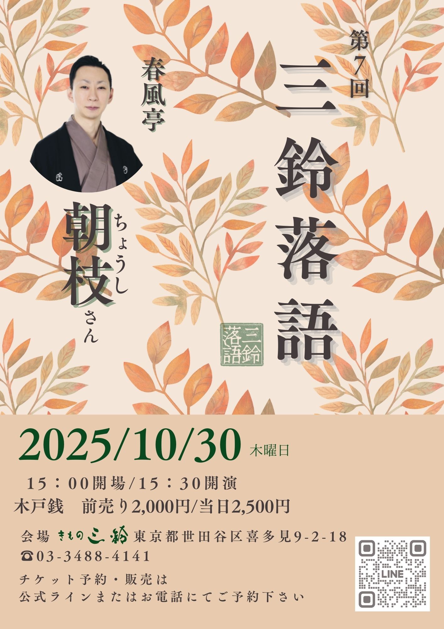 【イベント<10月>】第7回三鈴落語 春風亭朝枝さん 独演会 2025年10月30日(木)